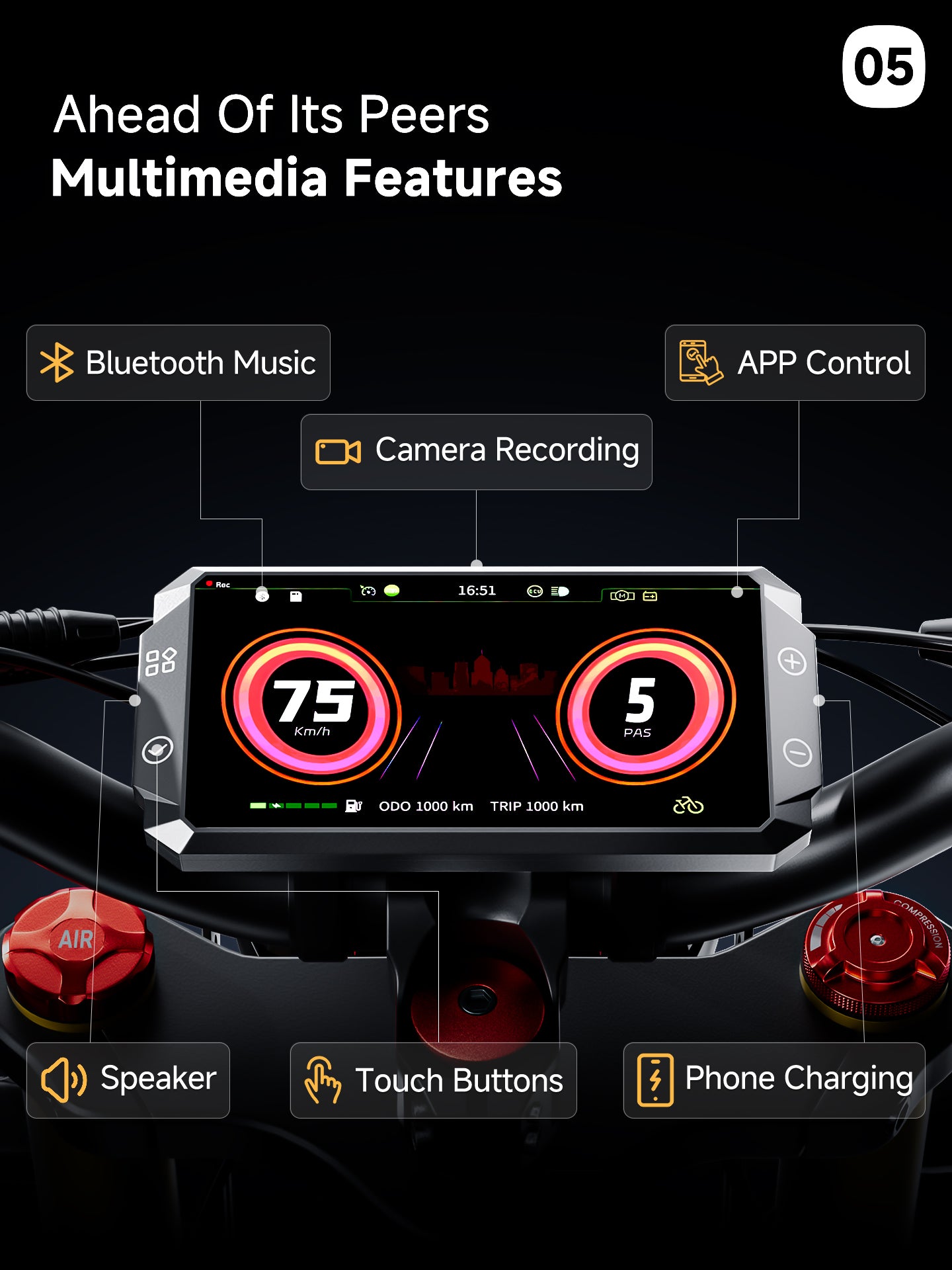 The 5" Multi-function display features a Bluetooth music, simply connect your phone via Bluetooth to play your favorite tunes, making every ride more fun and enjoyable.